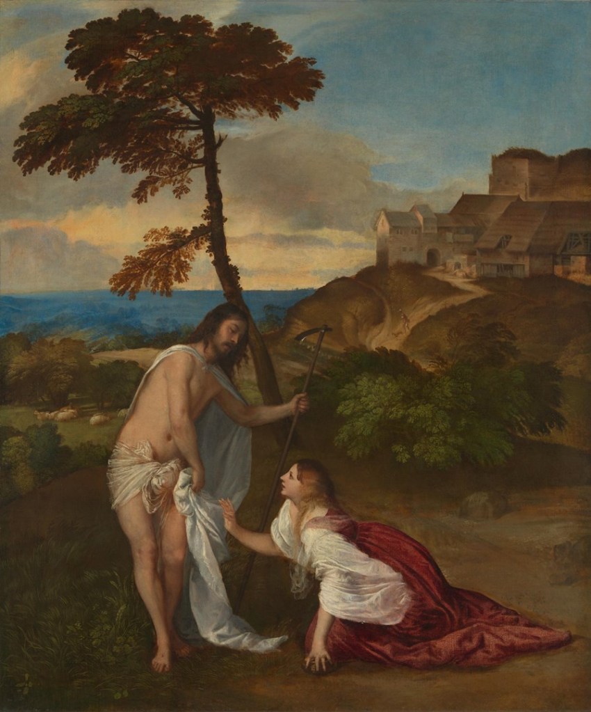 The image above is of Jesus and Mary Magdalene in the garden, when a distraught Mary realises that the one who addresses her is not the gardener but her risen Lord. Its title means “do not hold on to me” – the words Jesus says to her, as her first impulse is to cling to her friend. It is an image of aching loss, desperate longing, glimmering hope and the joyous love which overcomes death.